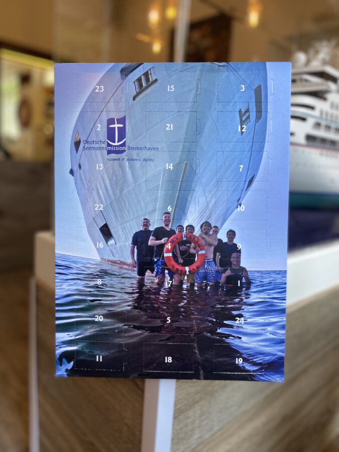 Der dritte Adventskalender der Seemannsmission Bremerhaven ist fertiggestellt – und auch in diesem Jahr gibt es wieder viele tolle Preise zu gewinnen! Das Motto in diesem Jahr lautet: „Das Leben an Bord“. Hinter jedem der 24 Türchen verbergen sich inspirierende Aussagen und Einblicke von Seeleuten und Mitarbeitenden der Seemannsmission – jeweils mit einem passenden Foto. Dank unserer großzügigen Sponsoren warten hinter den Türchen nicht nur bewegende Geschichten, sondern auch attraktive Gewinne. Diese werden während der Zeit vom 01.12 – 24.12.2025 verlost.