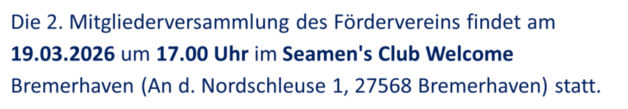 Die zweite Mitgliederversammlung des Fördervereins der Seemannsmission Bremerhaven e.V. steht an: Am 19.03.2026 um 17.00 Uhr im Seamen’s Club Welcome Bremerhaven.